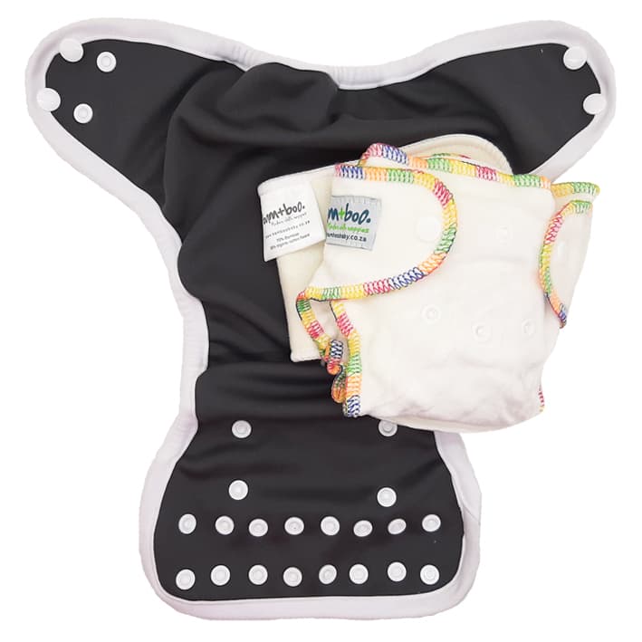 - Bamboo Fitted Nappy: Outer is soft bamboo cotton velour while the inside is luxurious bamboo cotton fleece (70% bamboo/30% cotton). Contains 2 inserts in the same 100% natural, super-absorbent fabric. The larger insert snaps into the back of the nappy and folds over to give extra absorbency. The smaller insert can be placed in the wet zone. That gives you 9 layers of absorbency where you need it most, plus the actual nappy fabric.