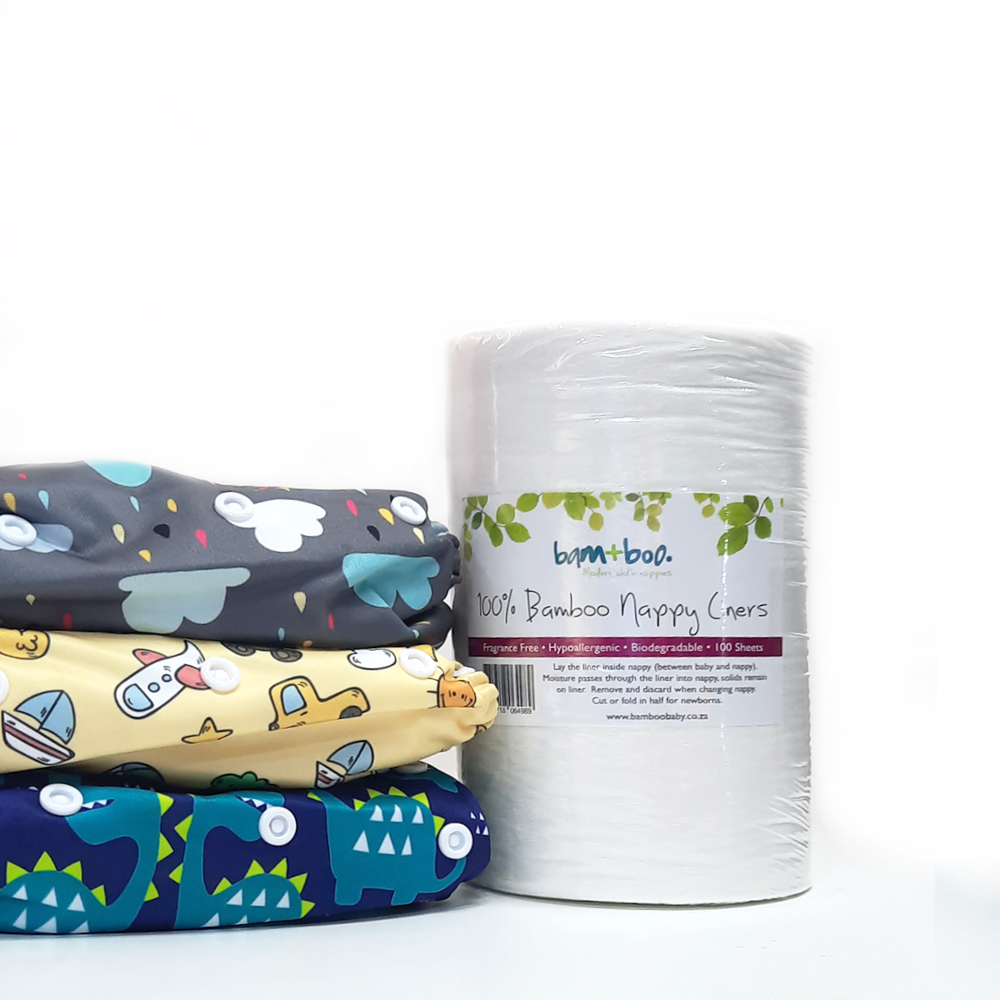 If you are not sure which Cloth Nappy will suit you and your baby, this discounted Starter Kit is a must. It contains three of our most popular day time nappies that fit babies from 5 – 17kgs. The Sleeve nappy has a double row of snaps around the waist as well as four rows of rise snaps in the front to adjust the sizing. It has two high absorbency Bamboo inserts which snap into the waterproof cover and snap together. The outer PUL cover has double leg gussets, and the inner is Suede Cloth which will keep baby dry. The All-in-one Nappy has a double row of snaps around the waist as well as four rows of rise snaps in the front to adjust the sizing. This super trim nappy has two absorbing Bamboo inserts which are sewn into the waterproof cover, making this cloth diaper quick and easy to use. The budget friendly Pocket Nappy has a single row of snaps around the waist and three rows of rise snaps in the front to adjust the sizing. The nappy has a pocket where you can stuff in the absorbing insert. The inner is Suede Cloth to keep baby dry. Each nappy comes with 2 absorbing inserts. The first is a three layer Microfibre insert, which absorbs liquid quickly. The second is a 4 layer Bamboo insert.